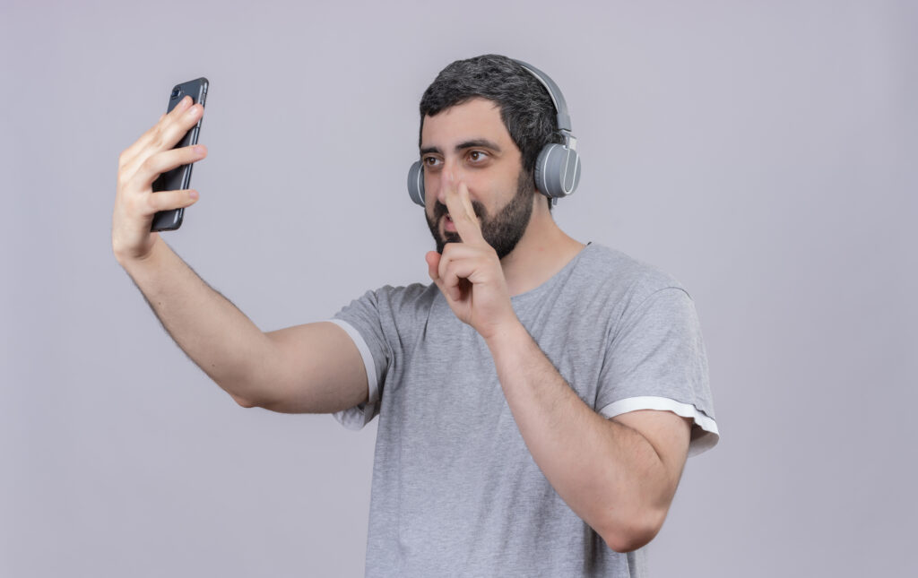 pleased young handsome caucasian man wearing headphones doing peace sign and taking selfie with mobile phone isolated on white background with copy space